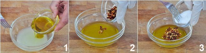 In a bowl, mix the lemon juice with the oil 1 the chili flakes 2 and the salt 3