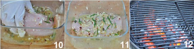 then turn the chicken slices well in the bowl so they absorb the marinade well 10 and leave them like this for an hour 11. Then bring the barbecue to temperature 12, placing a brick, previously covered with a sheet of aluminum foil, to heat on the grill.