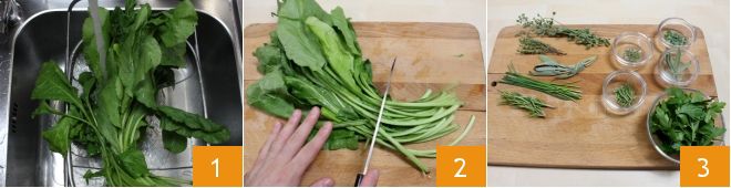 To prepare chicken in green sauce, start by cleaning the Swiss chard: wash them under running water 1 and place them on a cutting board, then remove the stems 2. Next, pluck all the aromatic herbs and transfer them into small bowls 3.