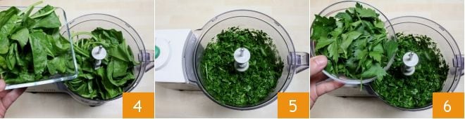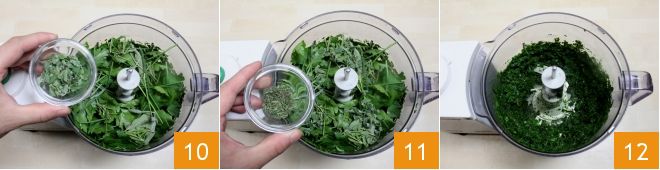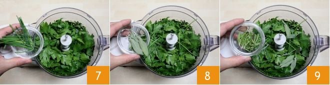 Place the cleaned Swiss chard in a blender 4 and blend until finely chopped 5. Now add the various aromatic herbs, starting with the parsley 6.