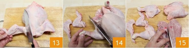 Proceed with cleaning and cutting the chicken: place the whole chicken on a cutting board and start by cutting off the wings 13, proceed by separating the thighs 14, and finally split and debone the breast, making sure to remove the Y-shaped bone and other pieces of cartilage 15. You can also use chicken that is already cut and deboned, found at the supermarket.