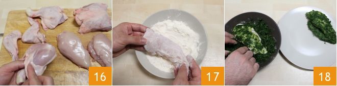 Skin the various pieces of chicken you have cut 16, then flour them 17. Once floured, take the Swiss chard and aromatic herbs mixture you set aside and coat the chicken pieces on both sides 18.