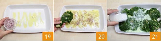 Pour a drizzle of oil into a large baking dish and add a clove of garlic cut in half, along with the finely chopped shallot you prepared earlier 19. Now place the floured and coated chicken pieces in the dish 20 and drizzle them with milk to soften them and prevent drying during cooking 21. You can also substitute milk with vegetable broth, find out how to prepare it by consulting our Cooking School: Vegetable broth.