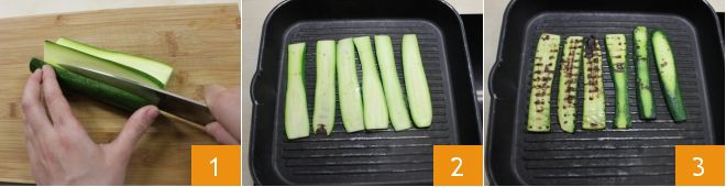 To prepare the chicken in a cage, start with the zucchinis: make sure they are quite long and wide, this way you will cover the chicken breast more easily. Wash them carefully, trim them, and cut 8 slices about 2-3 mm thick along the length with a knife or mandoline 1. Heat a grill, and once hot, place the zucchini slices on it 2. Cook on both sides for a few minutes until they are slightly charred and softened 3.