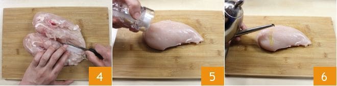 Now cut and debone the chicken breast: place the whole chicken breast on a cutting board and split it in half 4. Remove the y-shaped bone and feel along the cut side to ensure there are no remaining cartilage pieces. Salt 5, pepper, and oil 6 the chicken breasts to taste on both sides.