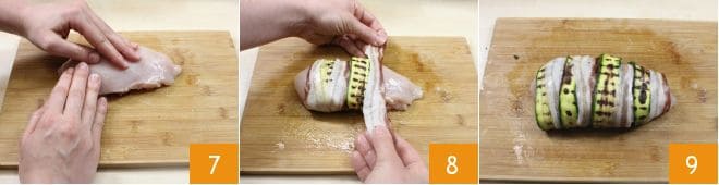 Massage the chicken breasts with your hands to evenly season the surface 7. Then wrap the chicken breasts alternating the grilled zucchini slices with slices of bacon 8. Face the pinker side of the bacon outward, so the chicken breasts will appear more colorful. In total, you should use about 4 slices of zucchini and 4 slices of bacon. Cover the chicken breasts on one side and then fold down the excess parts to cover the other side as well 9. You will need fairly long slices of zucchini and bacon; if they are shorter, cover one side first, turn the breast, and cover the other side with additional slices.