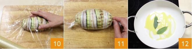 Wrap the stuffed chicken breasts with plastic wrap 10, tightening the wrap at the sides like a candy 11. This operation will help give the breasts a cylindrical shape. Then transfer them to the fridge and let them rest for 1 hour. Once wrapped in plastic wrap, you can let the chicken breasts rest overnight, so you can prepare them the evening before for the next day, giving the chicken a more regular shape. After this time, take a large pan, pour a drizzle of oil, and brown 1 peeled garlic clove with a couple of bay leaves 12.