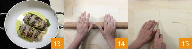 Once the garlic is golden, take the chicken breasts you've been letting rest out of the fridge, remove the plastic wrap, and brown them in the pan on both sides over low heat for about 20 minutes 13. When cooked, let the chicken breasts cool on a rack, allowing the excess oil to drip off. In the meantime, prepare the cage: take a ready-made rectangular puff pastry roll, place it on a floured work surface, and briefly work it with the rolling pin 14. Then cut 1/3 lengthwise and divide the piece in half, creating 2 rectangles which will serve as the base for the cage 15.