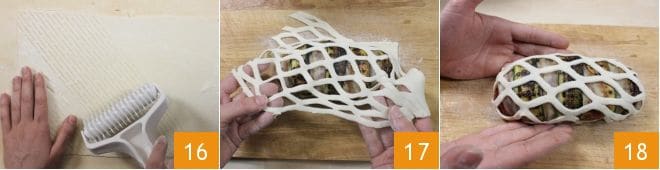 Cut the rest of the puff pastry with the special lattice cutter, after dusting the roller with flour 16 or if you don't have the tool, you can cut strips of puff pastry about half a cm wide and cross them over the chicken like a lattice pie. Then place the stuffed chicken breast on the puff pastry base, beat an egg and, using a brush, brush the edges of the base. Then gently spread the puff pastry net you created over the chicken breasts 17. Finally, fold the excess net edges towards the base, sealing the 'cage' well 18.