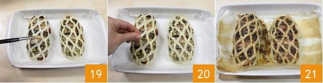 Place the caged chicken breasts in a rectangular baking pan lined with parchment paper and now brush the surface with the beaten egg 19. Sprinkle the cage with white sesame seeds 20 and bake in a preheated static oven at 392°F for about 40 minutes. When the surface is well golden 21, let it cool slightly and then slice it. Your chicken in a cage is ready to be served and enjoyed even cold, perhaps accompanied by mustard or our fake mayonnaise!
