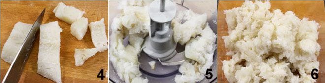 then cut it into pieces 4. Remove the bones from the cod fillets with the help of tweezers and finely chop them with a knife, or put them in the mixer for a few seconds (5-6).