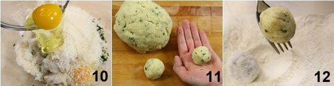 then in the beaten egg, and finally in the breadcrumbs 13. Fry the balls in hot vegetable oil 14. When the balls are golden, drain them with a slotted spoon and place them on paper towels 15 to absorb the excess oil.
