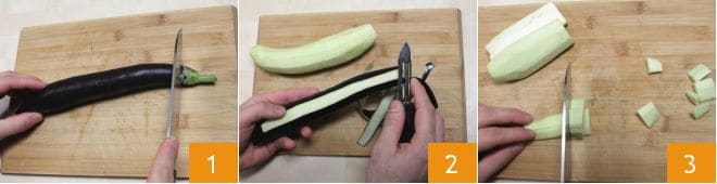 To prepare the eggplant balls with a smoked cheese heart, start by cleaning and cutting the eggplants: remove the stalk 1 and base, peel them with a vegetable peeler 2 and, after cutting them in half, dice them 3. To learn how to best perform this operation, consult the Cooking School: how to clean and cut eggplant.