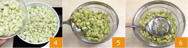 Fill a large pot with water, and when the water reaches boiling, add the diced eggplant 4. Let them blanch for 4-5 minutes, then drain them well with a colander placed over a bowl 5. Press the cooked cubes with the back of a skimmer or spoon 6 to remove all excess water.