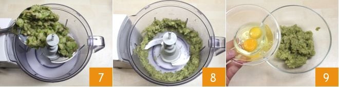 Now transfer the squeezed eggplant into a food processor 7 and blend for a few seconds until they become a purée 8. Pour the mixture into a bowl and add the cracked eggs 9.