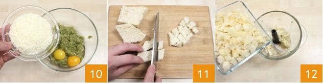 Add the grated pecorino cheese 10 and place the stale bread on a cutting board, then cut it into chunks 11, which you will transfer to a food processor. Blend for a few seconds until finely crumbled 12.