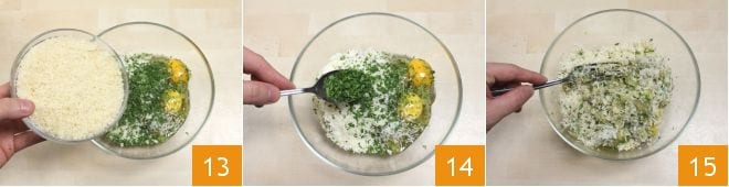 At this point, add the crumbled stale bread to the eggplant and egg mixture 13, also add parsley 14, salt, and pepper to taste, and mix everything with a fork to combine 15.