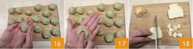 Once you have a homogeneous and compact mixture, work it with your hands, forming balls 16. Create a small well in the center of the balls by pressing lightly with a fingertip 17. Now place the smoked cheese on a cutting board and cut it into rather small cubes 18.