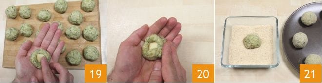 Position the smoked cheese cubes inside the well you created in each ball 19, then manipulate the edges of the balls to compact them, enclosing the smoked cheese heart inside and preventing it from leaking out during cooking 20. Pour the breadcrumbs into a bowl and coat each ball, turning them several times to ensure even breading 21.