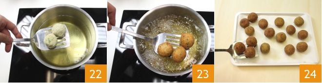 Heat peanut oil well in a pot with high sides and fry the breaded balls 22 until the surface is pleasantly golden 23. Drain them and remove excess oil by patting them with paper towels 24. For a lighter dish, place the balls on a baking sheet lined with parchment paper and bake in a preheated static oven at 350-400°F until golden. Once they have cooled slightly, all that remains is to enjoy your eggplant balls with a smoked cheese heart!