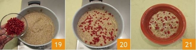 You can add the whole pomegranate seeds (19-20) and serve your leek and pomegranate cream risotto as soon as it's made 21!