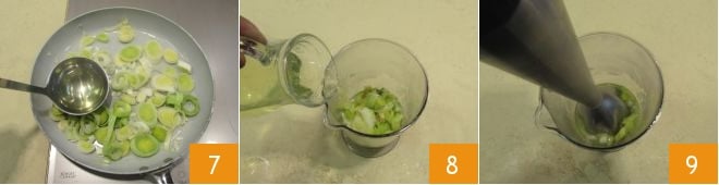 add a ladle of vegetable broth to aid in cooking: it will take about 5-10 minutes. Salt and pepper to taste at the end of cooking, then turn off the heat and let it cool slightly. Once ready, transfer it to a tall glass, add about 7 oz of vegetable broth 8, and blend with an immersion blender 9: you should obtain a creamy and homogeneous mixture.