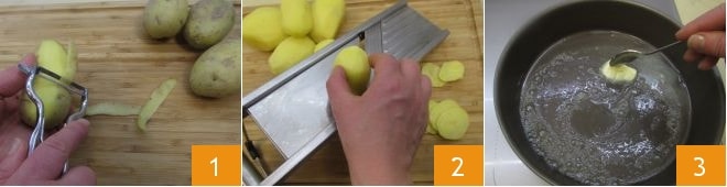 To make Pommes Anna, start by peeling the potatoes 1, then slice them with a mandoline set to a thickness of 1/16–1/8 inch 2 (you can also slice them with a knife to the indicated thickness). Place a pan suitable for oven cooking on the stove, melt 1.5 tablespoons of butter over moderate heat 3,