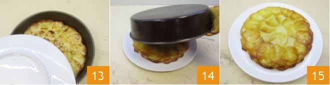 cover with the serving plate 13 and flip everything over 14; the Pommes Anna will be well caramelized on the surface 15, serve them hot!