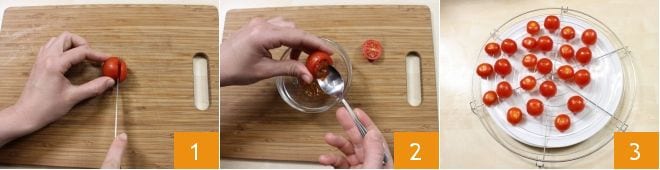 To prepare the baked cherry tomatoes stuffed with bulgur, start by washing and thoroughly drying the cherry tomatoes. Place them on a cutting board and cut off the top with a knife, setting it aside 1. Scoop out the tomatoes with a spoon to remove the seeds 2 and let them drain upside down on a rack 3.
