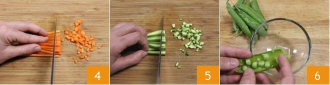 Meanwhile, prepare the filling: peel a carrot, place it on a cutting board, cut it into sticks, and then dice them 4. Rinse a zucchini well under water and trim it. Then cut it into sticks and dice 5. Now shell the fresh peas into a bowl, discarding the pods 6; you should obtain 30 g (1 oz) of shelled peas.