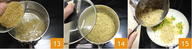 At this point, cook the bulgur: pour the water into a saucepan, add half a teaspoon of salt, and bring to a boil, then add the bulgur and cook for 7 minutes 13 or consult the cooking times indicated on the package. Once cooked, when the bulgur has absorbed the cooking water and swelled, cover for 5 minutes 14. After this time, add it to the vegetables and, if necessary, adjust the seasoning with salt and pepper 15.