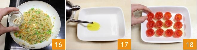 Add the toasted pine nuts to the bulgur with the vegetables 16 and stir to combine everything. Now take a baking dish or tray, drizzle with a little oil 17, and place the hollowed-out cherry tomatoes 18, lightly salting them.