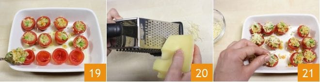 Then fill them with the bulgur and vegetable mixture 19. Grate the desired amount of Emmental 20 and sprinkle it over the stuffed tomatoes 21.