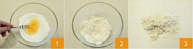 To prepare the poor ravioli, start with the Homemade pasta (sheets and shapes): pour the flour into a bowl, make a well in the center, and add the eggs. Start beating the eggs with a fork 1, gradually incorporating the flour. When the eggs have been absorbed 2, begin kneading the dough by hand and then transfer it to a work surface 3 to knead it vigorously.