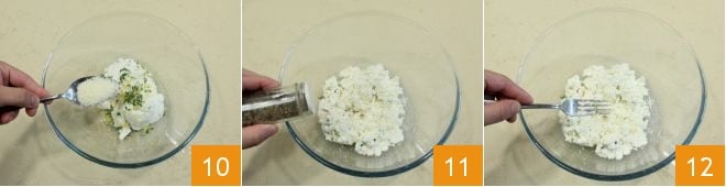 Add the grated Grana Padano PDO 10, a pinch of salt and pepper 11, and mix the ingredients with a fork 12. Pour the obtained cream into a pastry bag and place it in the refrigerator until ready to use.