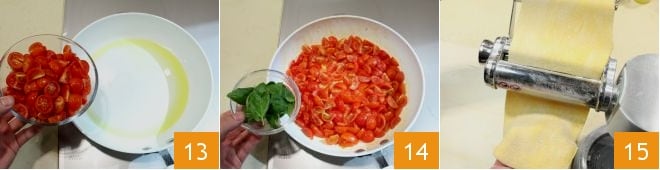 Move on to preparing the sauce: in a pan, pour the oil and lightly sauté a garlic clove, then add the cherry tomatoes cut into wedges 13 (you can remove the garlic). Salt, pepper to taste, and let cook for about 10 minutes. When the cherry tomatoes have softened, add the basil leaves and turn off the heat 14. Then take the egg pasta, divide it into pieces, and work with one piece at a time, keeping the rest covered with plastic wrap so it doesn't dry out. Roll out a small piece of dough and pass it through the machine, starting from the highest level to the lowest to obtain a very thin sheet 15 (or you can roll the sheet with a long rolling pin). Proceed the same way with all the dough.