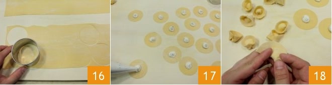 From the sheet, cut out discs using a 2.75-inch (7 cm) round cutter 16. Fill each disc with a dollop of ricotta cream placed in the center 17. To close each ravioli, fold the disc into a half-moon and with your thumb and index finger, fold the edges of the dough inward 18.