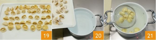 Transfer the prepared ravioli onto a lightly floured tray 19. When ready, drop them into a large pot of gently boiling salted water 20: cook them for about 5 minutes, then drain them with a slotted spoon 21.
