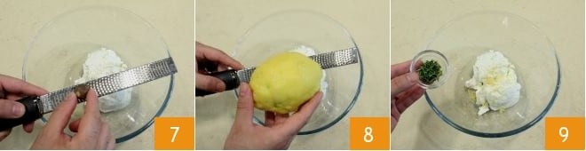 Flavor the ricotta with grated nutmeg 7, the zest of an untreated lemon 8, and thyme leaves 9.