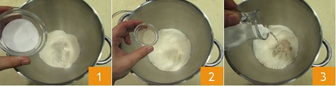 To make the poppy seed, almond, and marzipan roll, start with the dough: in the bowl of a stand mixer fitted with a flat beater, place sifted flour, granulated sugar 1, and dried yeast 2. Pour in the milk slowly 3,