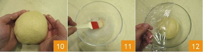 Continue until the dough is hooked, then place it on a work surface and shape it into a round shape 10, butter a bowl 11, place the dough ball inside, cover with plastic wrap 12, and let it rise in the oven with the light on for about 4 hours or until the dough has tripled in volume.