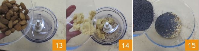 In the meantime, in a mixer bowl, place the almonds 13, chopped marzipan 14, blend everything together, then transfer the mixture to a bowl, add the poppy seeds 15,
