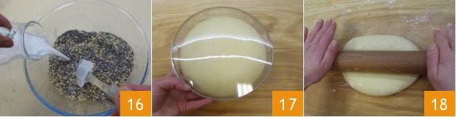 finally pour in the milk slowly, mixing with a spatula 16 to combine all the ingredients. Take back the dough that has tripled in volume 17, roll it out with a rolling pin on a floured work surface 18
