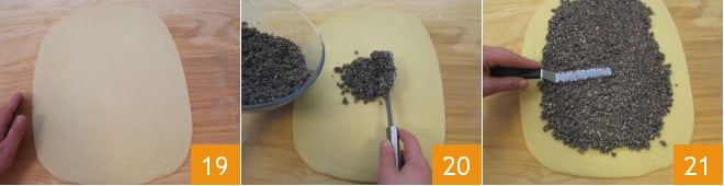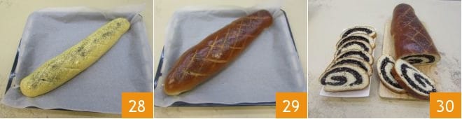 score the surface with a smooth-bladed knife with crossed diagonals to create a diamond pattern 28, sprinkle with poppy seeds 29 and bake in a preheated static oven at 340°F for 30 minutes (or in a convection oven at 300°F for 20 minutes). Once cooked, take the poppy seed, almond, and marzipan roll out of the oven, let it cool, and then serve it in slices 30.
