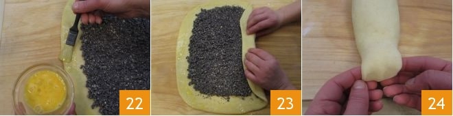 Brush the edge with beaten egg 22. Roll the sheet from the long side 23 and seal the dough at the seams and fold the two ends down to close 24.