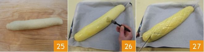 You will have obtained your roll 25, place it on a baking tray lined with parchment paper 26, brush the surface with beaten egg 27,