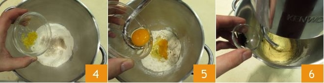 flavor with grated lemon zest 4. Finally, add the eggs and turn on the mixer 5, when all the ingredients are mixed, replace the flat beater with the dough hook, add the vanilla bean seeds 6,