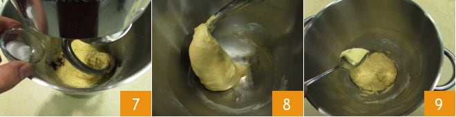 salt 7, knead with the hook 8 and without stopping the machine, add the butter one piece at a time 9, waiting for it to be incorporated before adding another.