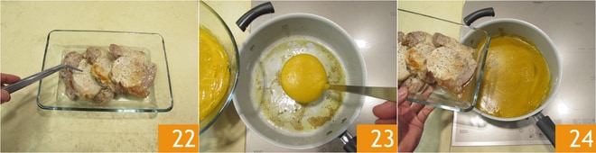 Once cooked, remove them from the pan and keep them warm 22. In the same pan where the chops were cooked, pour the previously prepared pumpkin cream 23, add the meat 24.