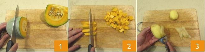 To prepare the pork chops with pumpkin cream and taleggio, first make the vegetable broth, which you will need for the preparation of the pumpkin cream. Then focus on the pumpkin cream: cut the pumpkin into slices 1, remove the outer skin, take out the seeds, then cut the flesh first into strips and then into cubes 2. Peel the potatoes 3